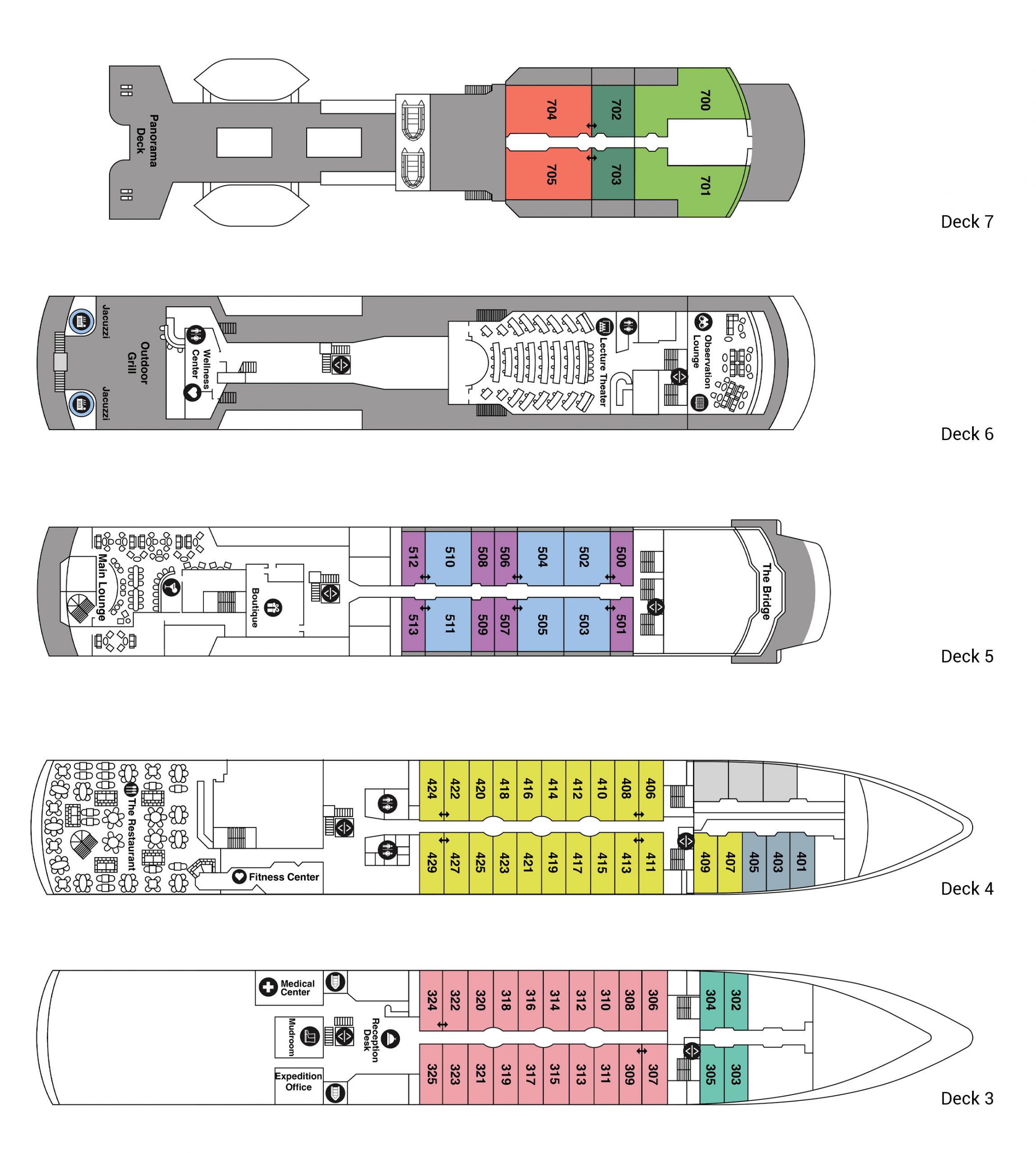 2 Betten oder Doppelbett, Balkon, separater Sitzbereich, Schreibtisch, Schminktisch, Bad mit Badewanne und separater Dusche, WC, Bademรคntel und Hausschuhe, Pflegeprodukte, Haartrockner, begehbarer Kleiderschrank, Safe, Kรผhlschrank, Flachbildfernseher mit interaktiver Medienbibliothek, 110/220-V-Wechselstromsteckdosen, individuell regulierbare Klimaanlage, Direktwahltelefon, Internetzugang auf dem gesamten Schiff. Obst und Sekt bei Ankunft, aufgefรผllte Minibar (Softdrinks, Sรคfte, Mineralwasser und Bier), kostenloser Wรคscheservice, Espressomaschine im Zimmer.Vortrรคge an Bord