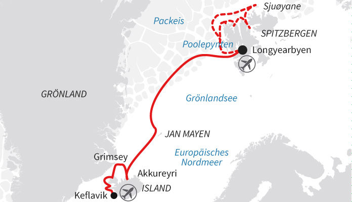 Dieses einzigartige Arktis-Abenteuer führt Sie von den magischen Fjorden Islands und der Insel Grimsey zum Packeis der zerklüfteten Küste Grönlands, bevor Sie das wilde und abgelegene Jan Mayen erkunden und in das Packeis der Grönlandsee eintauchen. Beenden Sie Ihr Abenteuer im Reich der Eisbären – Spitzbergen – und beobachten Sie unterwegs die berühmte Tierwelt.