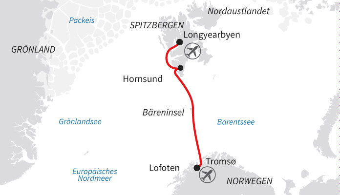 Route folgt den Grenzen der Norwegischen See und der Barentssee, die beide reich an Meereslebewesen sind: halten Sie Ausschau nach Walen, Robben und Zugvögel.