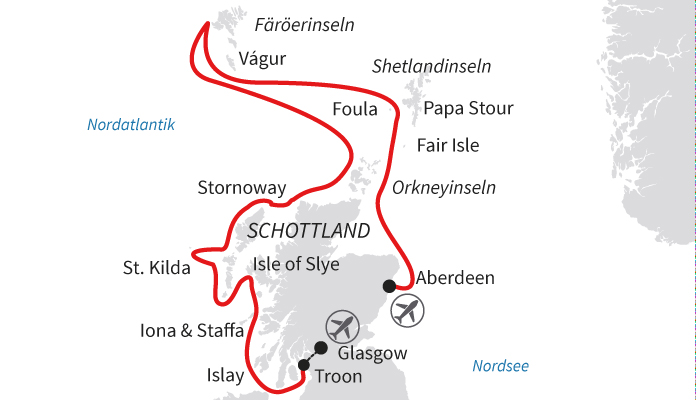 Aberdeen ist die drittgrößte Stadt in Schottland und hat eine wesentliche Bedeutung für die Wirtschaft des Landes. Viele Gebäude und Monumente bestehen aus Granit und sie wird deshalb auch als „Granite City“ bezeichnet. Mehrere Wale, darunter Orcas, sind in diesen Gewässern heimisch. Im Süden sehen Sie den Leuchtturm auf Girdle Ness, der vom Großvater von Robert Louis Stevenson entworfen wurde, dem berühmten schottischen Schriftsteller, der uns solche Klassiker wie Die Schatzinsel und Dr. Jekyll und Mr. Hyde schenkte.