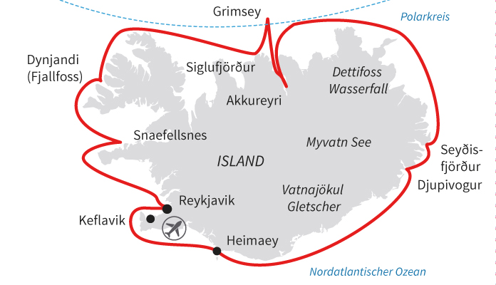 Je nach Flugzeit können Sie Reykjavik auf eigene Faust erkunden: Einen ausgezeichneten Überblick über die Geschichte und Kultur Islands findn Sie im großartigen Nationalmuseum und Kulturhaus. Auch die HallgrÃmskirkja, das berühmteste Wahrzeichen von ReykjavÃk, sollten Sie unbedingt besuchen. Naturhistorisch Interessierten empfiehlt das Museum Whales of Iceland, in dem Modelle der 23 in Island vorkommenden Walarten in Originalgröße ausgestellt sind.